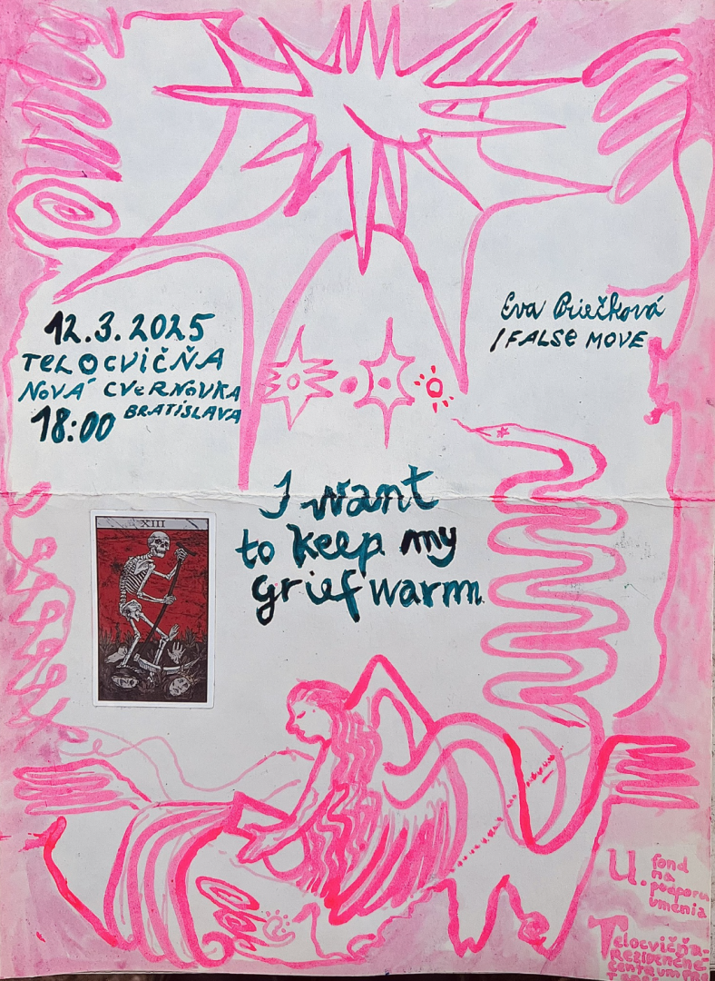 je prednáška/performancia o zdieľaní zdrojov týkajúcich sa smrti a smútku. Smútok sa stal mojou fascináciou a ako navrhuje Francis Weller, radšej ho budem udržiavať v teple, aby sa mohol hýbať, než by sa stal usadeninou mojej duše. Verím, že vám táto prednáška môže poskytnúť aj praktické informácie. Možno nájdete aj inšpiráciu, ktorú si môžete vziať do vlastných procesov smútenia. Pretože môj úprimný názor je, že smútok je tu a zatiaľ sa nikam nechystá. Na rôznych úrovniach.