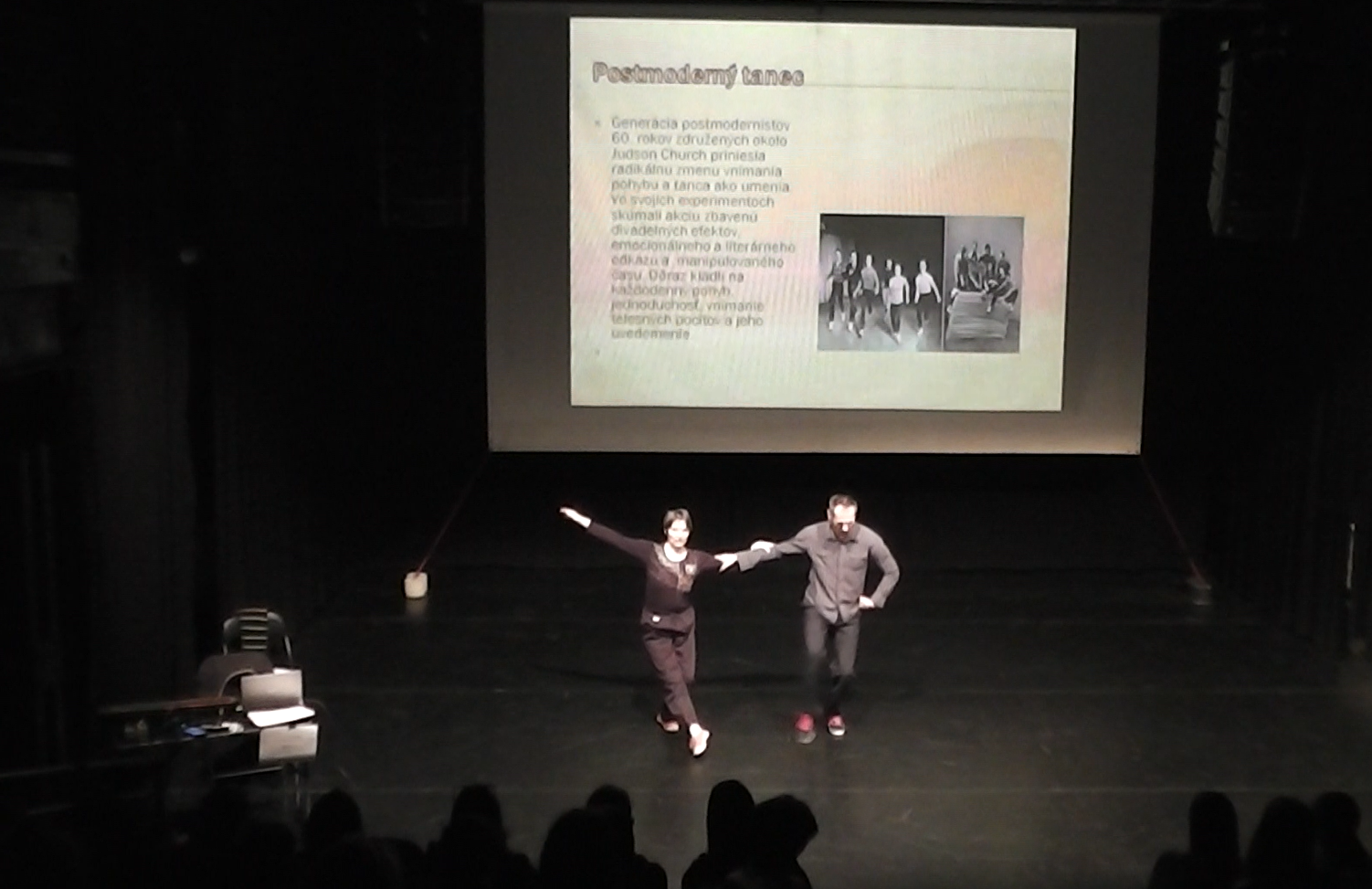 Prednáška sa opiera o východiská post moderného tanca a osobnosti, ktoré ho tvorili, a súčasne ponúka experiment v podobe performatívnej prednášky. Využíva priestor medzi prednáškou s autentickými video ukážkami, spolu s tanečnými ukážkami demonštrujúcimi princípy a vzťahy témy. Využívame originálnu verziu predstavenia "Tria A" (choreografia Yvonne Rainer), kontaktnú improvizáciu a formálne kompozičné metódy. Tanečné ukážky tancujú Anna Sedlačková a Daniel Raček spolu s Michaelou Mihaľou a vybranými študentmi, ktorí sa zúčastnia tematického workshopu.