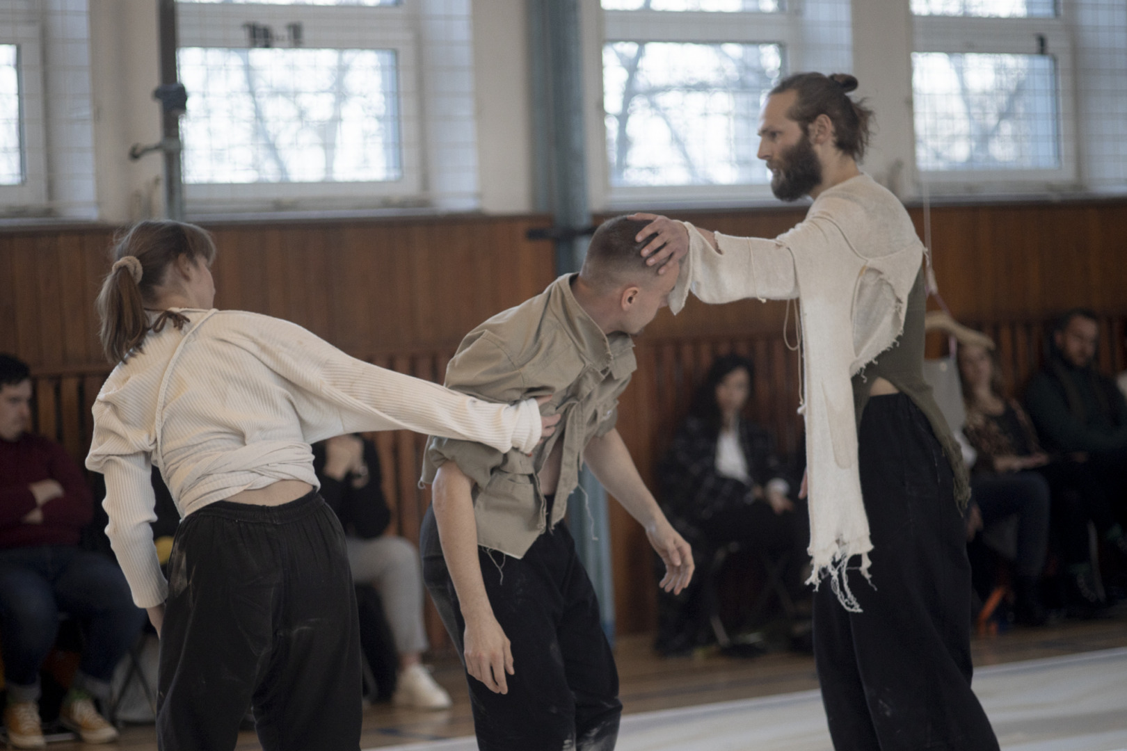 Trio tanečníkov sa na seba najprv ladí – zvukovo aj pohybovo. Každý začína v inom bode priestoru, mimo hlavného „javiska“. Dlhé „aaaaaa“, ktoré na úvod ťahajú svojimi hlasmi, neašpiruje na melódiu, ide skôr o akúsi kolektívnu zvukovú vibráciu, v ktorej hľadajú niečo, čo slovami nedokážu pomenovať. Chvenie hlasu je tu v niečom paralelné tancu – komunikuje bez použitia jazyka, bez slov.