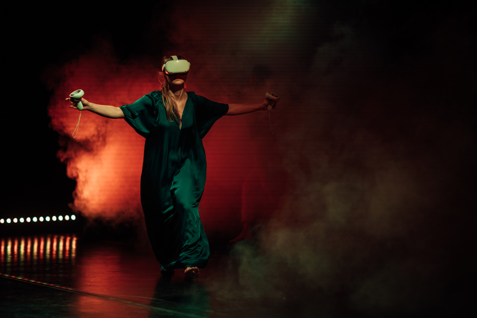 Výrazným obrazom je scéna, v ktorej si Budzáková nasadzuje VR set a začína sa pohybovať vo svete, ktorý publikum nevidí. Sleduje jej telo „zvonka“, chýba referenčný rámec, na ktorý reaguje. Tanečné telo sa ocitá vo zvláštnom napätí: jeho percepcia je presunutá do virtuálneho priestoru, zatiaľ čo jeho fyzická prítomnosť zostáva ukotvená v realite. Pohyb sa stáva čiastočne nekoordinovaným, fragmentovaným, telo reaguje na impulzy, ktoré nie sú zdieľané s okolím. VR technológia je zásahom do ontológie tanečného tela, narúša tradičnú logiku tanečného pohybu – orientáciu v priestore, vzťah k publiku a vedomú kontrolu nad telom. Premieňa ho na telo, ktoré sa pohybuje podľa neviditeľných pravidiel.