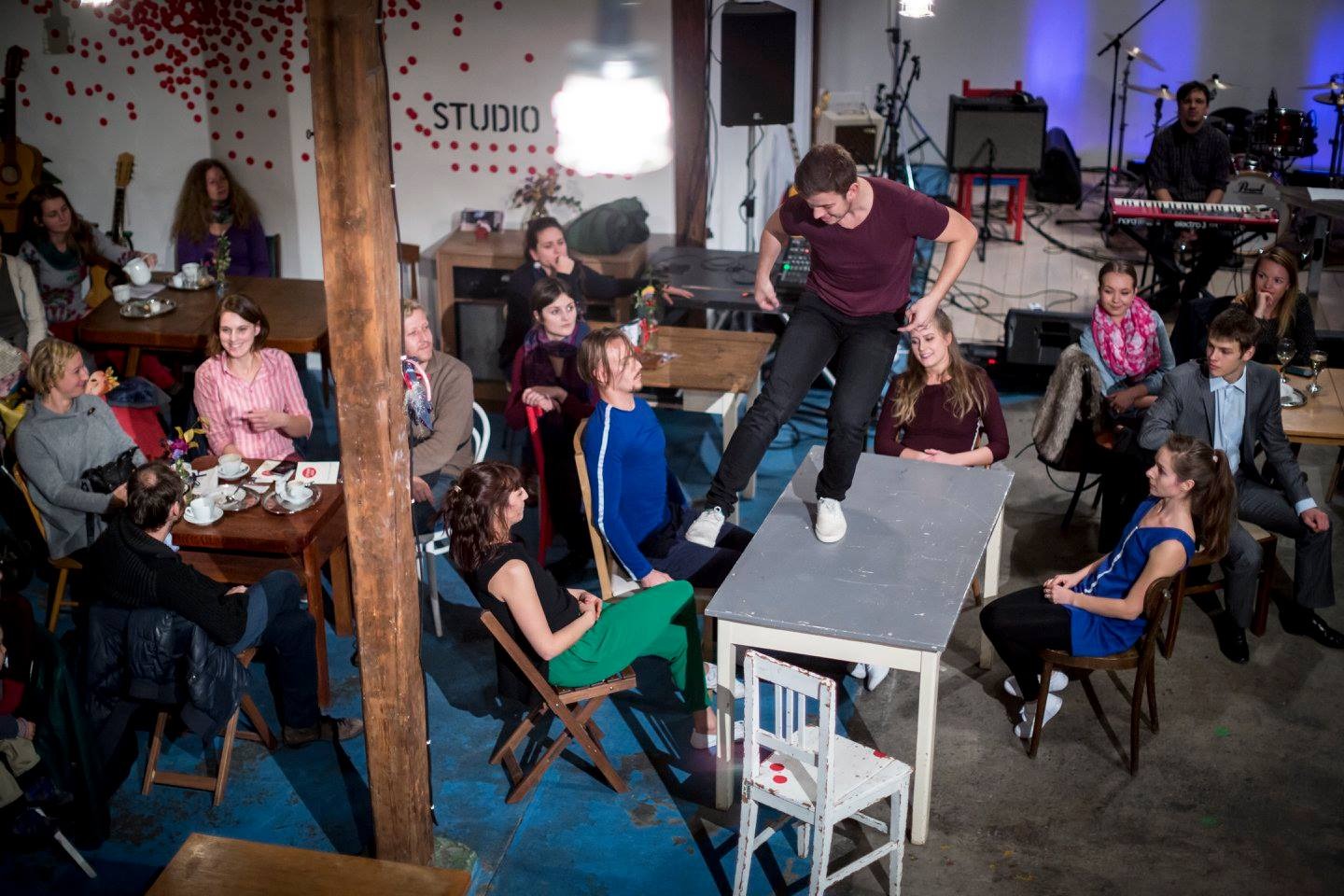 A site-specific performance brings its spectators a new experience of contemporary dance in an unusual space of a café. The main focus of the piece is on the maximal use of senses which are a gateway of feeling and understanding, not only the dance, but the world around us and ourselves in it as well. Sensory memory is the starting point. It creates the basis for exploration of the relations among the visual, verbal, and non-verbal aspect of the expression – from mechanics to sensation, from mind to feelings.