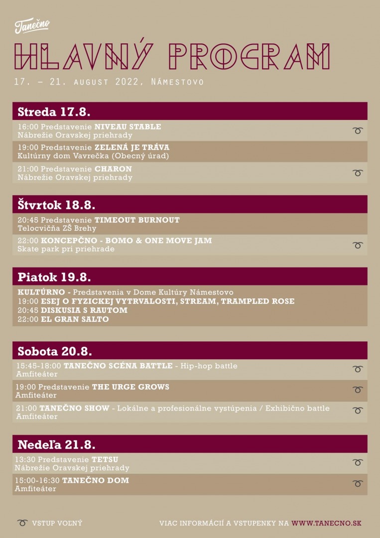 Chceme s vami tráviť viac času - dlhšie workshopy, viac predstavení, bohatší program, ale aj možnosť len tak si spoločne zatancovať, porozprávať sa a užiť si letné dni pri Oravskej priehrade. Veríme, že takto môžeme budovať komunitu, ale aj ukázať verejnosti umenie zblízka. Určite si preto rezervujte všetky dátumy, nudiť sa nebudete!