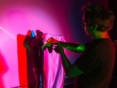 Svetelný dizajn javiskových diel – teória a princípy. Teoretické základy a praktické ukážky štandardných situácii (nesvietenie javiskového celku rôznymi spôsobmi, uhol a farba svetla, biela vs. čierna podlaha a horizont a i.).