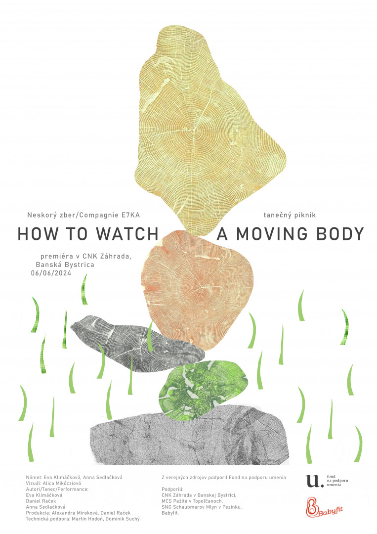 How to watch a moving body - "Ako sa pozerať na pohybujúce sa telo" je výsledkom spoluautorstva troch choreografov: Evy Klimáčkovej, Anky Sedlačkovej a Daniela Račka a je určený do verejného priestoru, konkrétne do záhrad, parkov či prírodných priestorov a je vhodný pre dospelých i deti. Zámerom tohto atypického performatívneho projektu je vytvorenie momentu a organického priestoru spolunažívania medzi performerom a divákom, zdieľanie rovnakého ekosystému dôvery, spolu pretvárať vzťah a dynamiku spoločného priestoru a slobodného pohľadu.