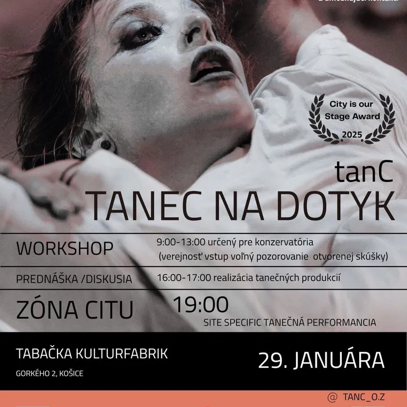 tanC je kolektív, ktorý verí v umenie ako nástroj osobného a spoločenského rozvoja. Ich cieľom je otvárať otázky, búrať stereotypy a zbavovať ľudí strachu z nepoznaného a nepochopeného. Kolektív vytvára priestor pre slobodný pohyb, tvorivosť a dialóg v rozmanitých podobách a do Košíc prichádza s celodenným programom Tanec na dotyk, ktorý má ambíciu osloviť študentsvo umeleckých škol. tanC neostáva pri klasickom zdieľaní svojich skúseností na pôdoryse workshopu, ponúka aj zdieľanie praktických informácií spojených so samotnou realizáciou umeleckých projektov. Práve prostredníctvom prednášky a následnej diskusie chce študentstvo motivovať k prvým samostatným krokom k relaizácii vlastných nápadov. Spoločne strávený deň uzavrie tanečná site-specific performancia.