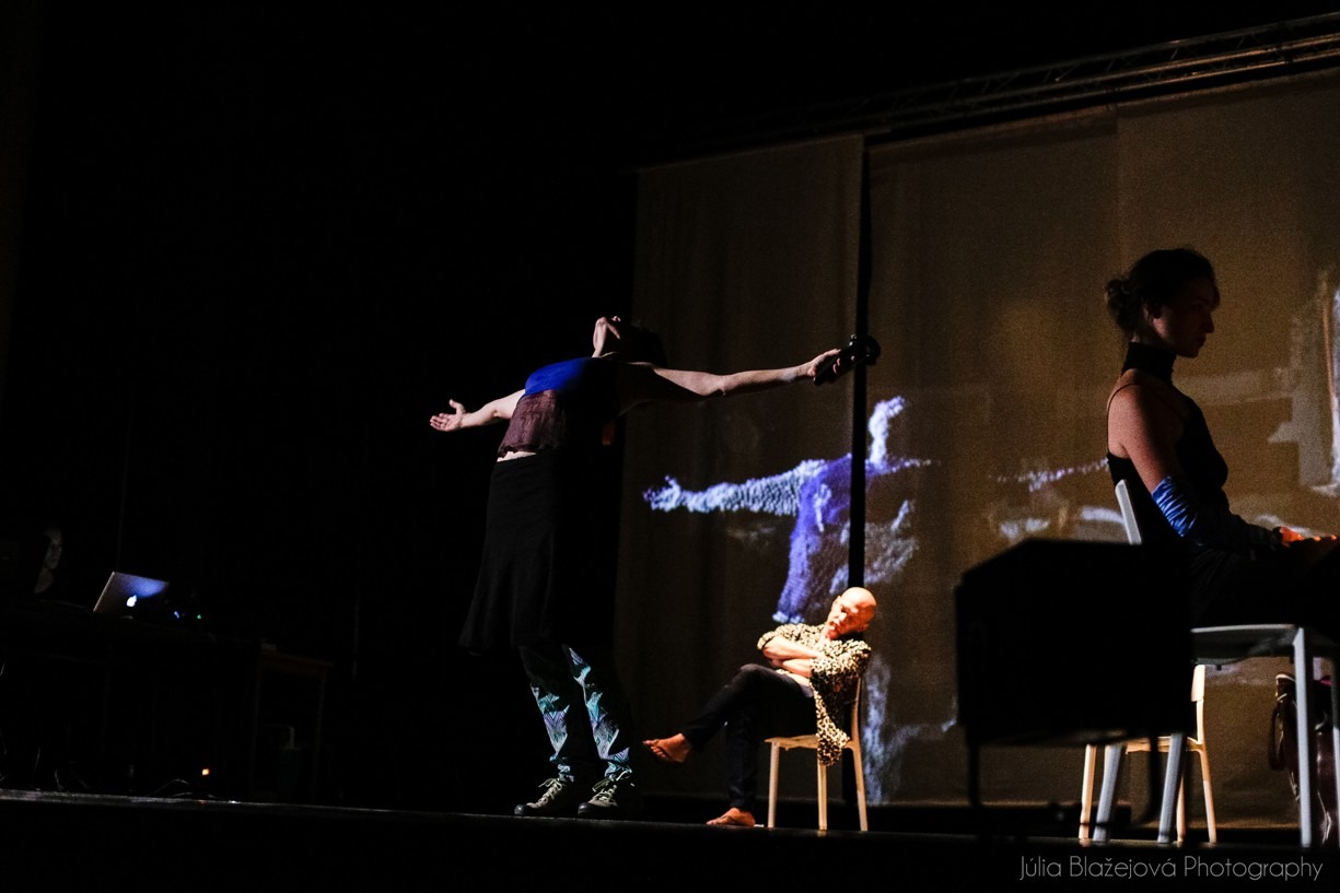 Slovak dancer and choreographer Petra Fornayová’s art manifests a sense of engagement that she has applied to look at the issue of the uneasy and complicated future. She introduces the perspectives of four generations of art professions. Visual artist Natália Okolicsányiová, director Ján Šimko, choreographer Petra Fornayová and documentarist Adam Hanuljak make very civil presentations of their fictitious paths in life. They are performers making reports about themselves. They present their performance via a video projection on a screen, react to each other in dialogue, interactions, or their individual indications on the stage. The performance is a subjective, generational testimony of established artists who need to come to terms with their own future prospects. Already in the introduction, they use an electronic questionnaire to elect their representative profession. Then, they alternate in presenting coordinated play on the stage (mostly using a combination of their live performance with the sounds and visuals projected onto the screen). This results in interesting combinations, for example, a live actor and his projection on the screen, or live dialogue and reproduced sound or visual (graphic) projection supported by dance performances, and so on. The leitmotif of these fragments in the play is a worry resulting from the doubts about what will happen to the world and to us – taking into account the perspective of several frightening predictions. On the backdrop of the play’s acting realizations, a constant fear of our own transience is frequently felt as a universal human worry.