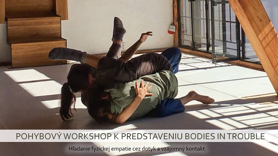 Pohybový workshop k predstaveniu Bodies in trouble bude slúžiť na priblíženie pohybových princípov a zadaní využívaných počas tvorby predstavenia. Hľadanie akejsi fyzickej empatie cez dotyk a vzájomný kontakt. Citlivé počúvanie hudby a vyladenie sa smerom ku kontemplatívnosti alebo naopak bizarnosti spojenej s výberom hudobných skladateliek stojacich na pomyselnej periférií. Voľné ponáranie sa do asociácií, imaginácií a ich prepájanie s fyzikalitou tela.