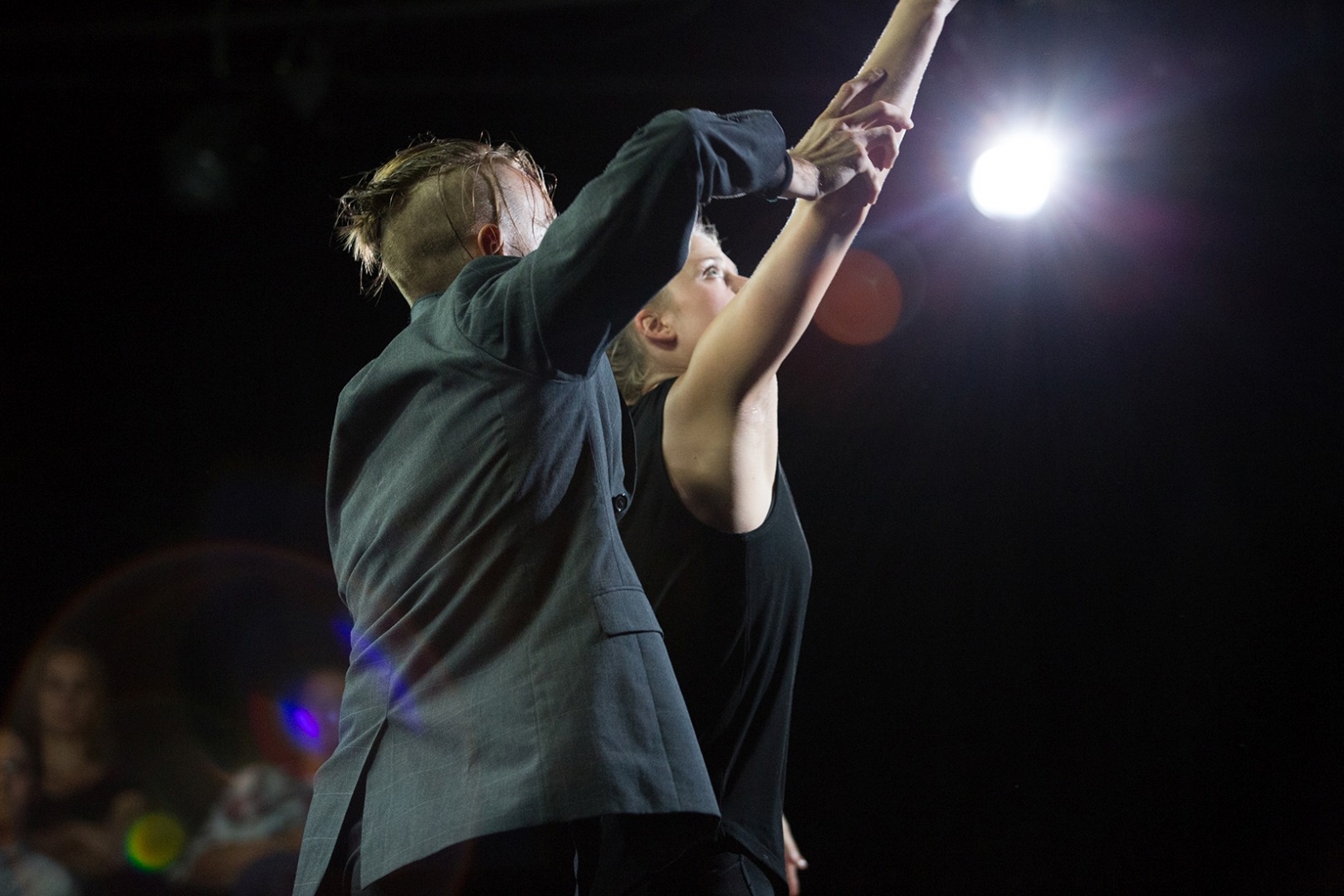 Young, fresh, even somewhat cheeky work. Generational. A body of work with contemporary language, performative-dance, done in a style close to the generation of millennials. The work consists of 3 parts, each of them following a different, very diverse dramaturgy. The first and the third part is more expressive and dynamic, the middle passage is static. The introduction is based on strong interaction with the audience – spreading to mobile applications and commenting, profile tracking, letting the audience enter into apparent privacy, behind the scenes of our masks.