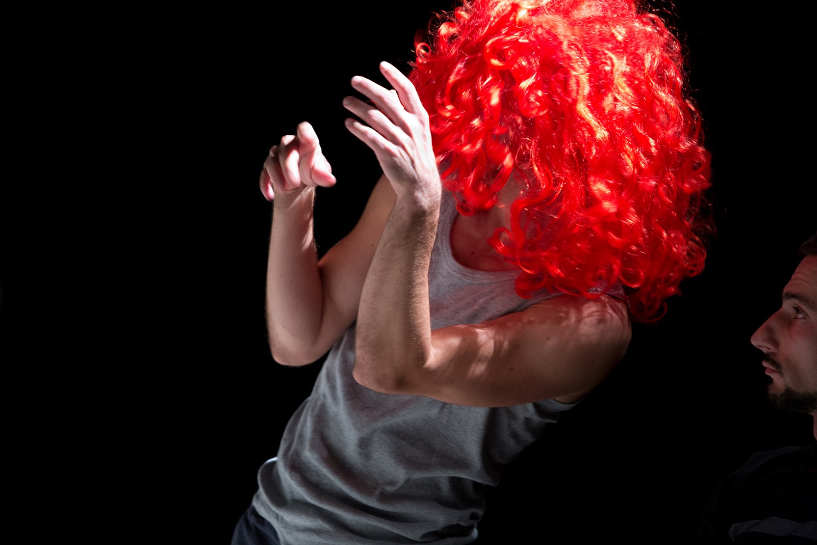 The performance deals with the topic of object and subject, questions the position of the audience and plays with the function of the performative body. The body here is a research material, playfully showing different aspects of physicality, constantly on the edge of subjectivity of the performer and the act of becoming some kind of character.