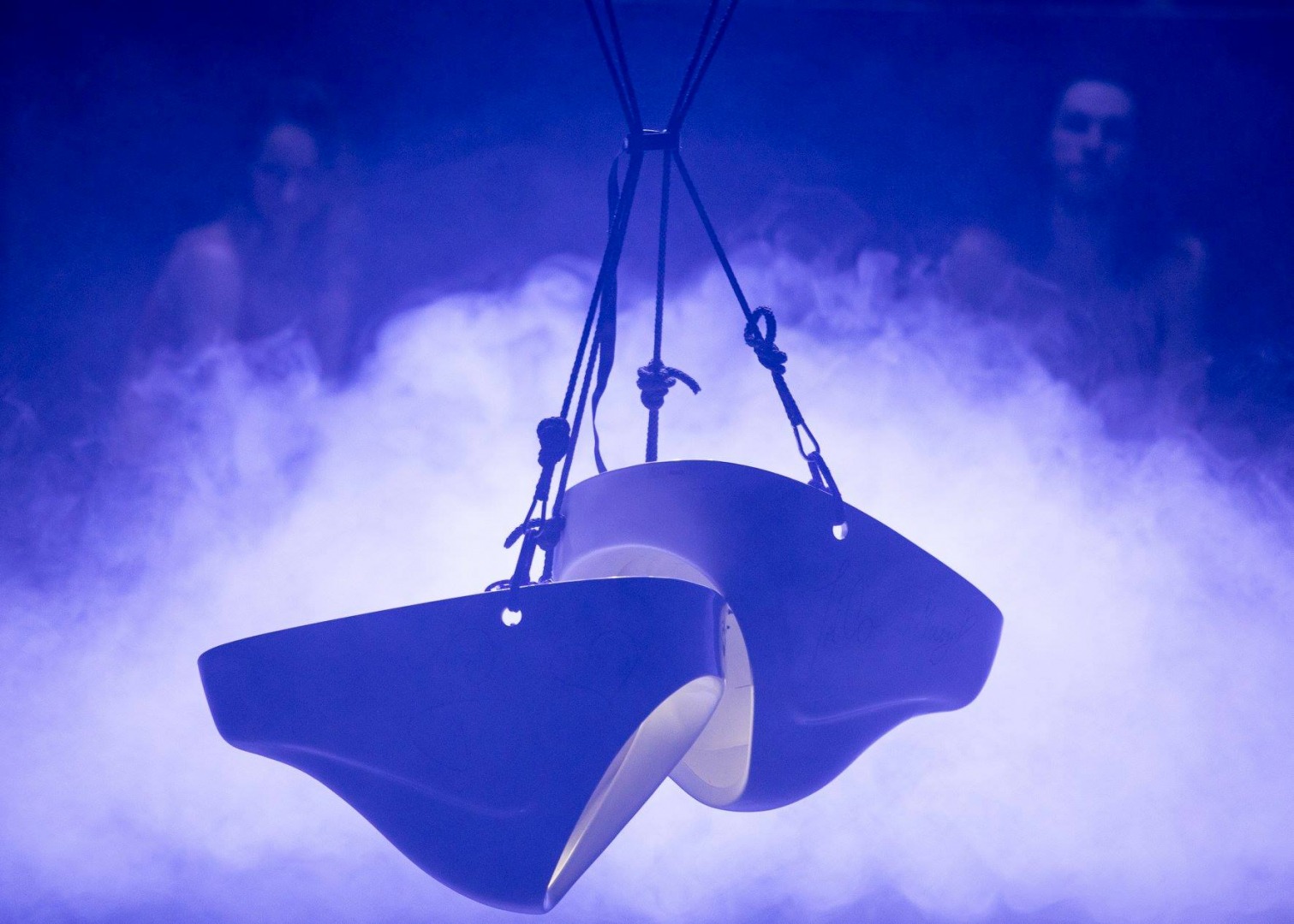 A piece on love, or even more on oscillation between drifting apart and getting closer. Performers manipulate with suspended urinals in the space, which limit their free movement on stage. Performance is a sort of a game with magic words “I love you”, which are almost impossible to be said, referring to all those trivial, ground-level things, such as urinals, so that these words not only have their strength, they literally attack the audience.