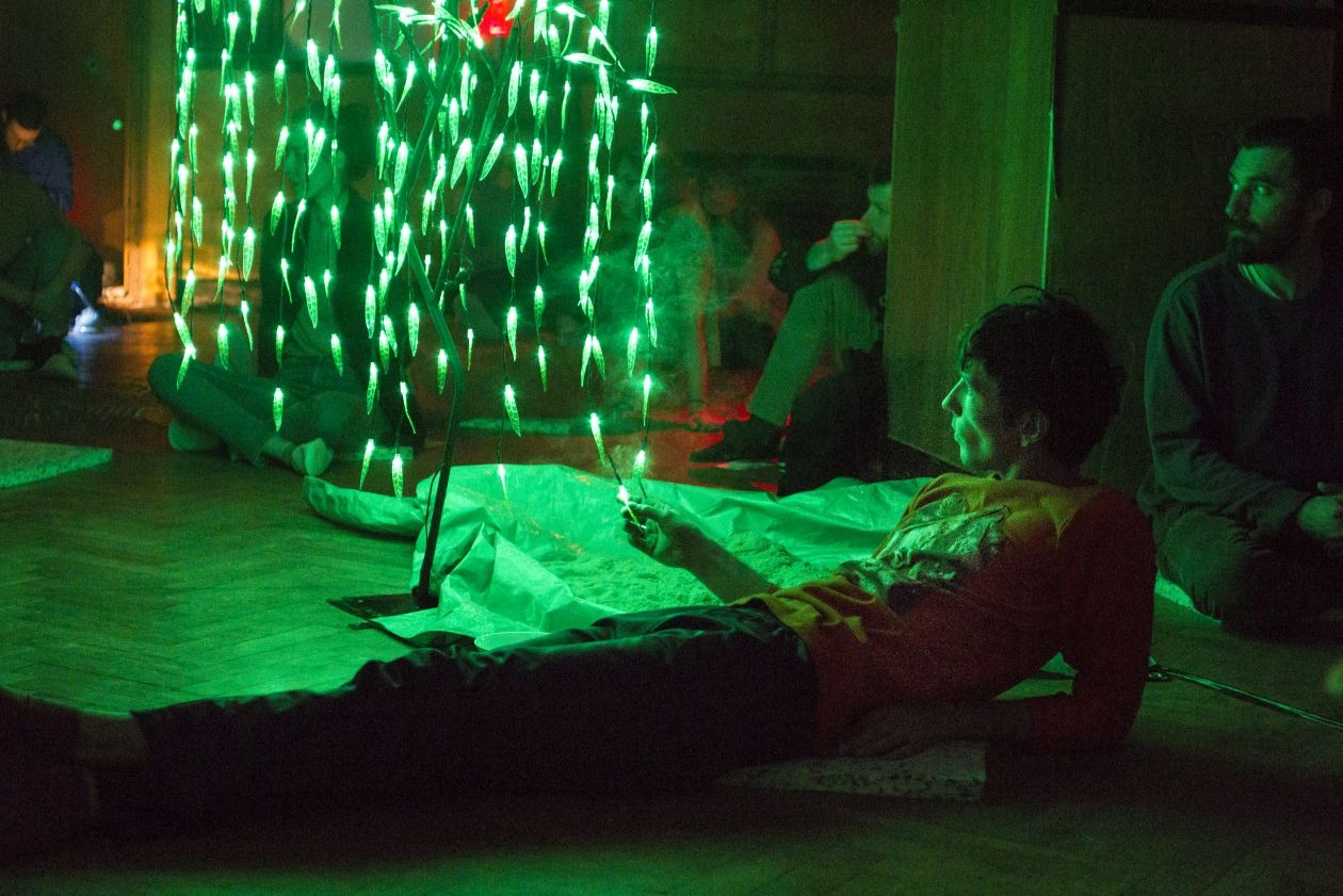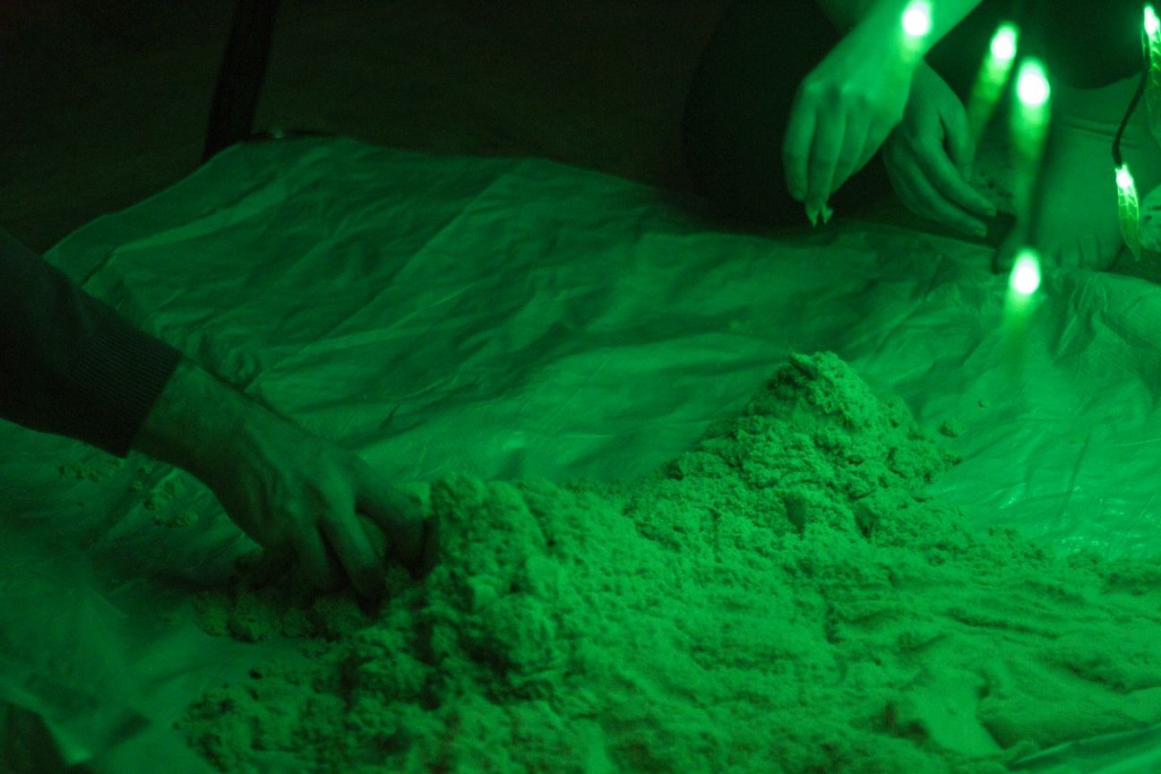 Shssssh... It’ll Be OK is a multisensory performance designed especially for a chosen venue. A participant is offered freedom of movement – they choose their own starting point of the environment exploration. The smells, visual and haptic sensations, sounds, voice, movement, and the overall atmosphere of the space are mixed to suit the variable needs of the collective recreation. Is it possible to transfer the ASMR principles to a theatre venue? Where are the boundaries between passive reception and active perception, spontaneous interactivity and choreography for the mirror neurons? Or, between a massage salon, a regional library, and a Snoezelen? How does the slime relate to photosynthesis, tapping of fingernails, marimo, lava, skin, and weeping willow?