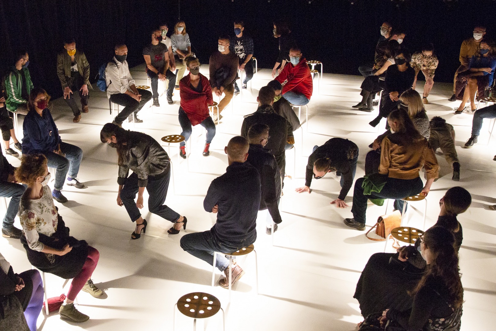 Where does the body end and the behavioral patterns begin into which we try to fit our bodies day after day? Is it at all possible to distinguish between them or have they grown into a single inseparable entity after all those years, a little like a broken leg into plaster? In this piece, Yuri Korec explores the violence we inflict on ourselves to mask who we really are. But also the violence that protects us from ourselves and our surroundings, scrutinizing us almost all the time. He subjects it to a thorough repeated re-examination with a group of dancers. It will become clear very soon that, more than being shaped by the frameworks, we are shaped by how we define ourselves towards them. Sapiens Territory notices moments when the body suddenly betrays us in contact with them, dismisses obedience, does not cooperate. It will be only then, if we can be ourselves at all.